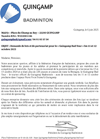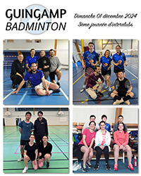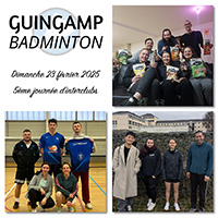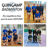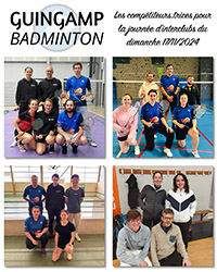 • Un nouveau projet va voir le jour avec l’organisation les 12 et 13 octobre 2024 de notre premier tournoi officiel intitulé « LE GUINGAMP BAD TOUR ». Ce dernier sera ouvert à tou.te.s (mais il faut être déjà inscrit.e dans un club de badminton), du niveau NC (non classé) à R4 et permettra aux joueurs.euses de s’affronter en formule simple, double et mixte. Une page dédiée à ce tournoi vient d’être créée sur notre site Internet et elle sera mise à jour petit à petit.