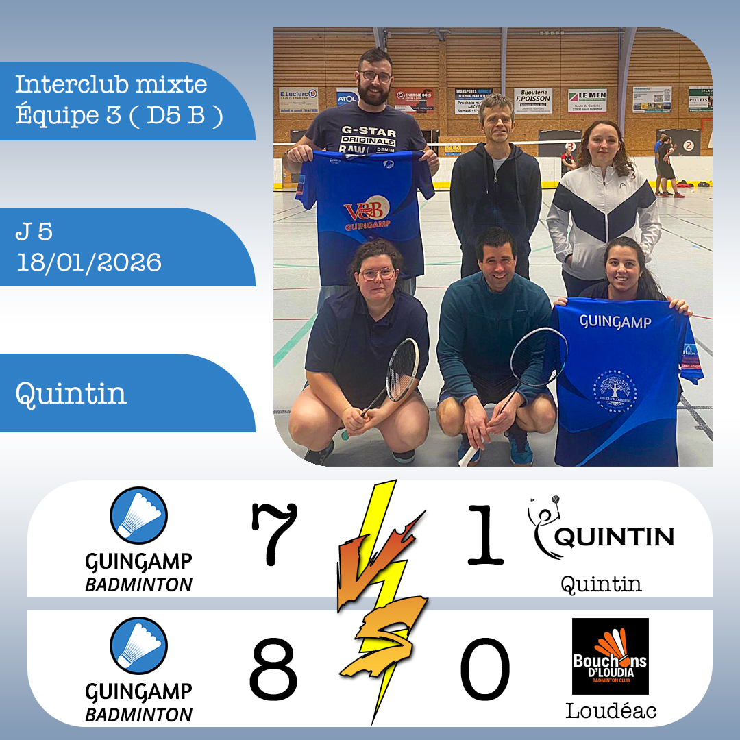 • Hier soir, notre équipe masculine élite 3 s’est déplacée à Ploufragan pour la 2ème journée de compétition en unisexe. Nos joueurs sont revenus victorieux avec un score de 4 à 2.