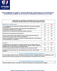 Nouveauté depuis la saison 2024-2025 : le certificat médical n’est pas obligatoire (mineurs comme adultes, même lors de votre première inscription au club). Le questionnaire de santé est suffisant. ATTENTION toutefois : si vous répondez OUI à une ou plusieurs question(s), le certificat médical sera alors nécessaire.